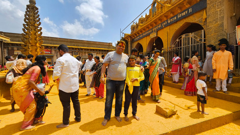 We then headed to Vitthal Rukmini Mandir in Pandharpur, which is 135 kilometres away. The main entrance of Lord Vittala's Temple faces the Chandrabhaga or Bhima River, and the Samadhi of Namadev and Chokamela are located at the entrance. Pilgrims first pray to the devotees and then enter the temple, where a small Ganesh Shrine is present as the first Shrine, followed by a hall where bhajans are performed.